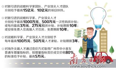 8月22日,黄埔区、广州开发区、广州高新区召开新闻发布会,正式发布《广州市黄埔区 广州开发区 广州高新区关于集聚海外尖端人才的若干措施》(政策主要内容共8条,下称“海外尖端人才8条”)。 这是该区继“美玉10条”“港澳青创10条”等人才政策后的又一人才新政。该政策进一步强化了对海外尖端人才的扶持,核心条款包括项目支持、人才资助、荐才奖励、一人一策、国民待遇、出入境便利、“一对一”服务等。 随着粤港澳大湾区建设迈向纵深发展,大量海外人才在寻找新的创新创业机会。“现在的我们比任何一个时期都更加渴求人才。”广州开发区政策研究室副主任熊卫国作政策解读时表示,该区将用政策和制度进一步提升人才服务水平,广揽海外战略科学家、产业顶尖人才,让人才体系“塔基更实、塔尖更高”,为全区高质量发展积蓄强大势能。 ●南方日报记者 李鹏程 通讯员 郭哲涵 潘淑莹 梅丹 黄埔每年将引进1到2个尖端人才团队 何谓“海外尖端人才”?“海外尖端人才8条”点明,这种人才是指在新一代信息技术、人工智能、生物医药、新能源、新材料、区块链、工业互联网、高端智能制造等该区重点发展领域,处于世界科技前沿和国际顶尖水平,掌握关键核心技术,能够为粤港澳大湾区高质量发展带来重大影响、重大突破的海外战略科学家及其团队核心成员、产业顶尖人才及其团队核心成员。其中,战略科学家重在科研水平,要能大幅提升区域科技创新显示度;产业顶尖人才重在考察产业化能力,要求全职引进。 “这里所说的‘海外’不限国籍,只要是从海外来黄埔区创新创业的战略科学家、产业顶尖人才都可获得相应扶持,包括外籍人才以及中国籍海外归国人才。”新闻发布会上,该区有关负责人解释道。 近年来,黄埔区、广州开发区、广州高新区不断强化人才政策制度优势。2017年,该区在全国率先推出的人才“美玉10条”政策,主要适用于杰出人才、优秀人才、精英人才,并对新引进的博士、硕士、本科毕业生以及名家名匠等给予相应扶持。当前,该区正从顶层设计的层面修订人才“美玉10条”,将推出2.0版本。 今年7月该区发布“港澳青创10条”,补贴对象年龄限定在18—45周岁,为鼓励港澳台青年融入内地,对港澳台居民不作学历限制,在港澳台高校毕业并获得高等教育学位的内地居民也可享受。 “海外尖端人才8条”是在上述普适性政策的基础上,抓牢“关键少数”,争取每年引进1—2个尖端人才团队,集聚一批海外“高精尖缺”人才。据悉,该区将尽快研究制定“海外尖端人才8条”兑现指南,并将“海外尖端人才8条”纳入人才政策体系的总体架构中,形成多层次、全覆盖、紧密衔接的人才政策体系。 高层次人才总量达730人居全市第一 据统计,黄埔区、广州开发区、广州高新区集聚了国家、省、市、区各级人才计划的高层次人才730人,数量位居全市各区第一、全省前列,其中绝大部分高层次人才携项目入驻——例如王晓东院士的百济神州、施一公院士的诺诚健华等。 塔尖人物带来核心产业项目,形成源源不断的“引力波”,促进人才链与产业链的双向优化,构建起以人才为核心的引智引技引资新格局。 拥有了数量可观的高层次人才,黄埔区、广州开发区、广州高新区对“高精尖缺”人才的渴望依旧高涨。为增强对科技前沿尖端人才的吸引力,“海外尖端人才8条”对新引进的战略科学家团队、产业顶尖人才团队分别开出了最高15亿元、10亿元的项目扶持。 其中对战略科学家团队项目的资助力度,相比该区人才“美玉10条”中对同类人才的最高扶持10亿元大幅增长5亿元。资助形式也更加多元化,包括项目资助、贷款贴息、研发经费补贴、经营贡献奖、股权投资等。 此外,海外尖端人才的房子、车子等生活硬件也从政策层面给予明确保障。对于新引进的战略科学家、产业顶尖人才,该区分别给予最高1000万元、500万元一次性购房补贴;或每月最高3万元、2万元租房补贴,补贴期限10年;或安排免费入住高端人才住房,免费期限10年。 “海外尖端人才8条”提到,对于战略科学家、产业顶尖人才,该区分别给予每年最高100万元、50万元人才津贴,补贴期限3年;对于海外尖端人才通过竞价方式取得广州市中小客车普通车增量指标的,该区按增量指标竞价成交价格80%的标准给予补贴,最高5万元。 值得一提的是,该政策突破了以往引才奖励只奖励引才机构、不奖励个人的局限,首次将被评为海外人才大使的战略科学家、产业顶尖人才作为奖励对象,如成功举荐引进人才或团队,将获得最高50万元引才奖励。此举将充分发挥尖端人才的核心影响力,鼓励以才引才,推动人才聚集。 团队带头人将全权负责财政扶持资金使用 战略科学家、产业顶尖人才在黄埔工作,将获得怎样的自主体验?“海外尖端人才8条”明确,在这里一切由团队带头人说了算。 该政策突破了目前人才使用财政扶持资金方式的多种限制,实施团队带头人全权负责制,赋予战略科学家、产业顶尖人才用人权、用财权、用物权、技术路线决定权、内部机构设置权和人才举荐权。战略科学家、产业顶尖人才举荐的其团队核心成员(每个团队不超过3名),将被直接认定为区优秀人才,并享受相应待遇。 “海外尖端人才8条”还将施行“一人一策”,为部分高端人才提供量身创设的发展条件。对成