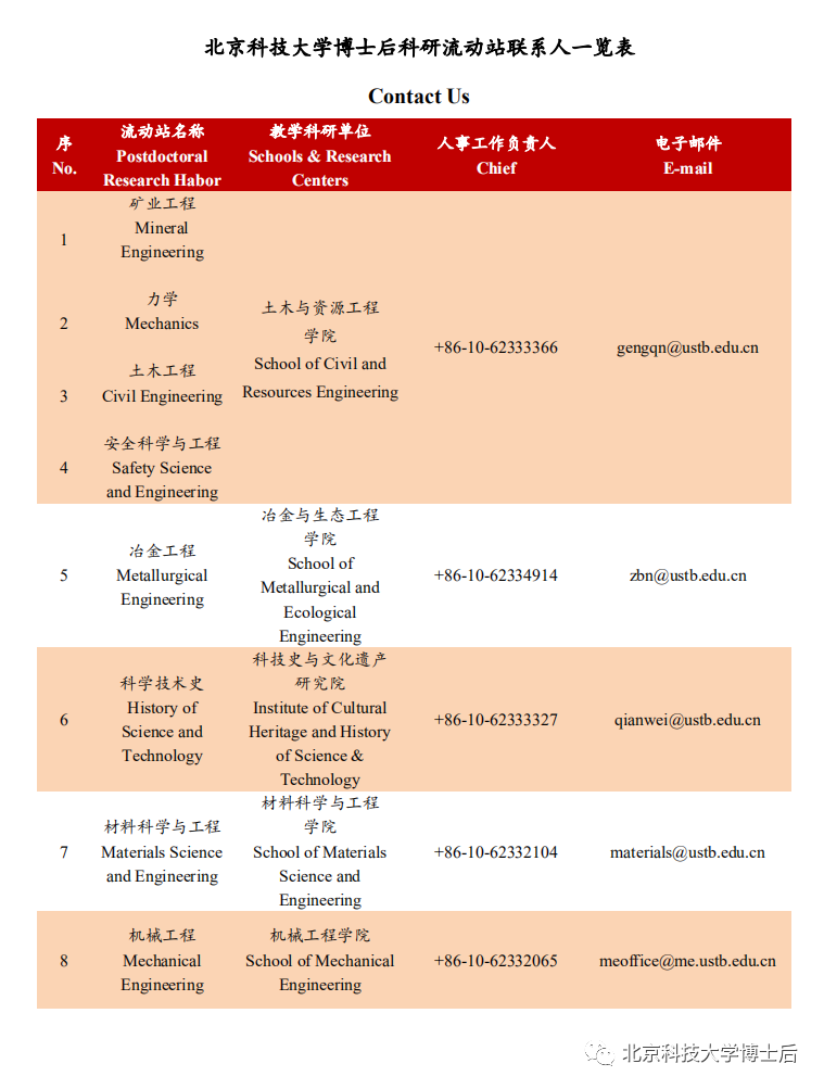 北京科技大学2020年博士后研究人员招聘启事